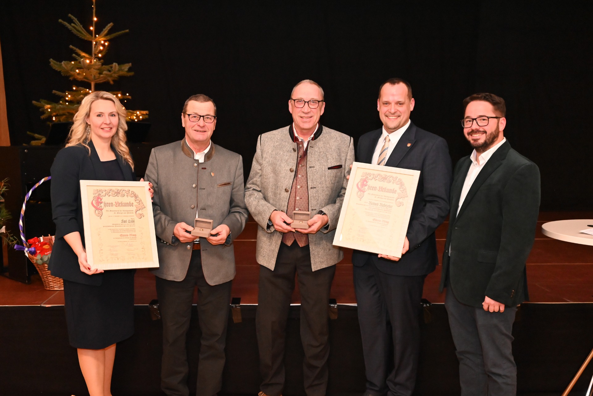 Die Ehrung wurde von Bürgermeister Christoph Haselsteiner, Vizebürgermeisterin Karin Grünberger sowie Geschäftsführendem Gemeinderat Georg Hahn vorgenommen. In ihren Ansprachen würdigten sie den außergewöhnlichen Einsatz und die Verdienste der beiden Geehrten für die positive Entwicklung der Gemeinde.