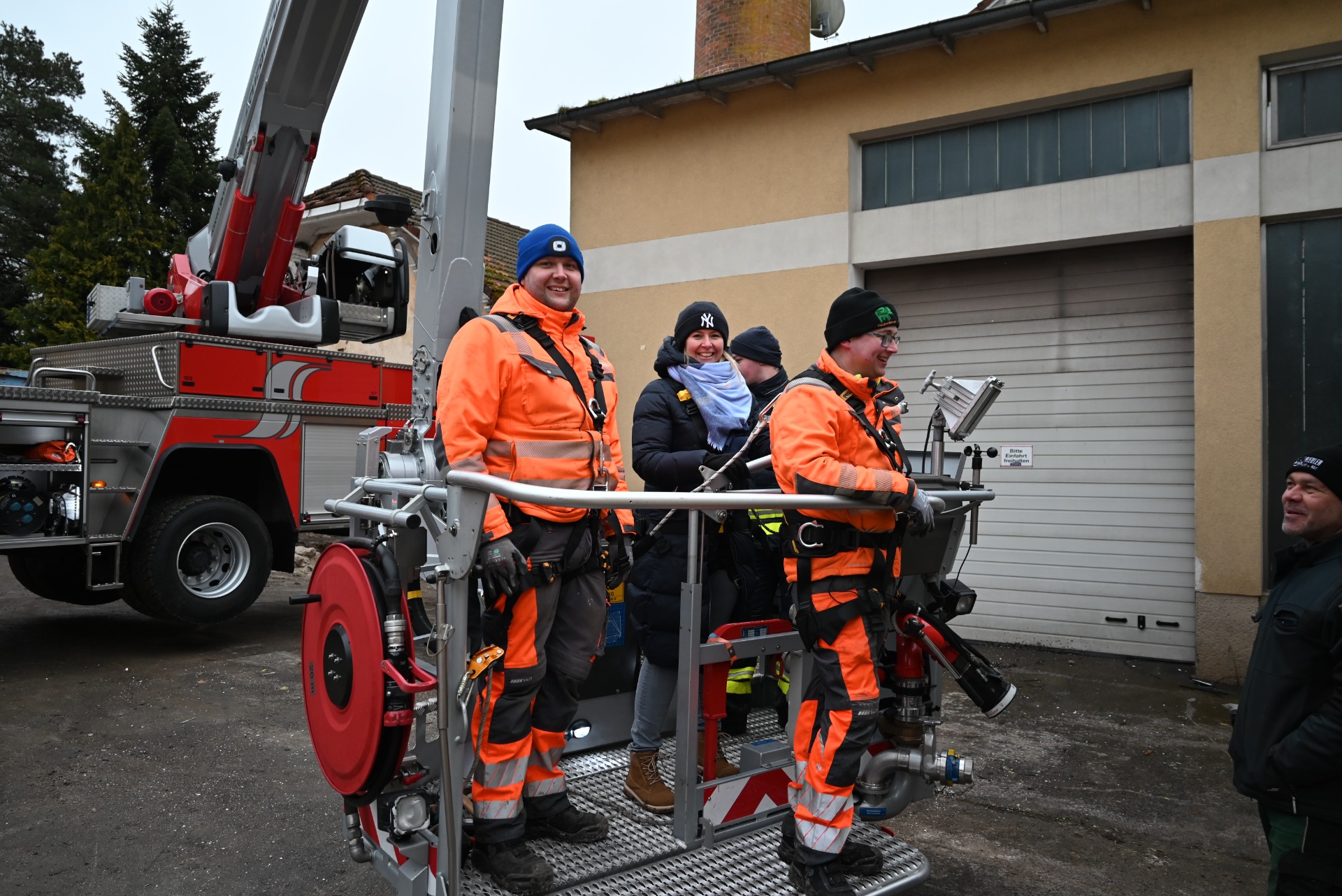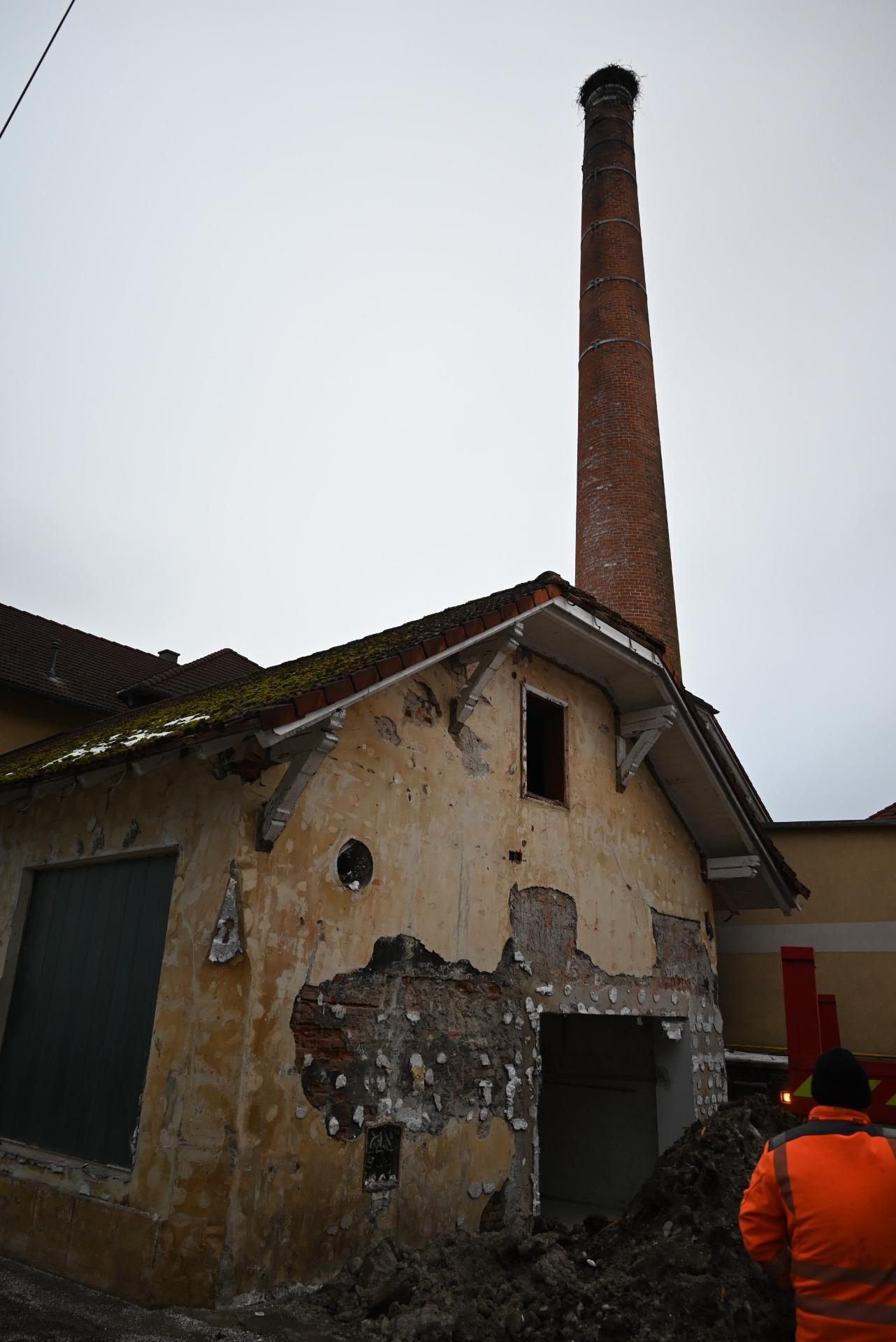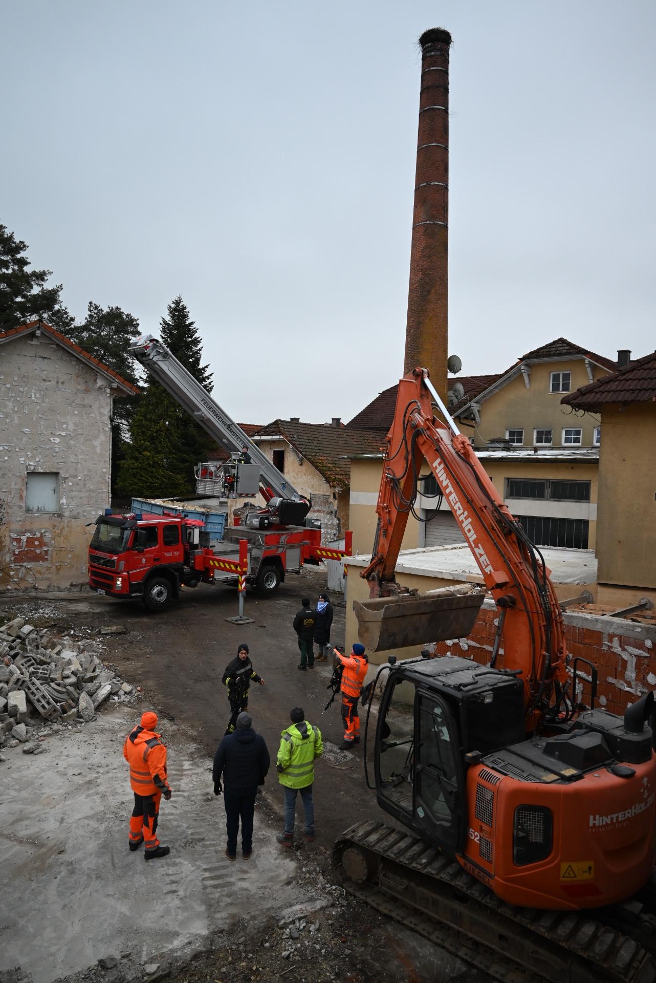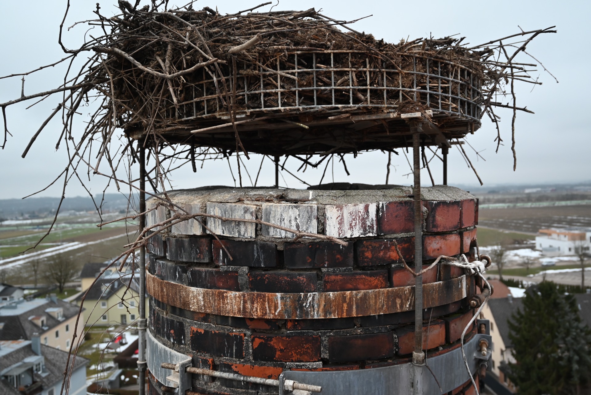 Bei der Begutachtung des Schornsteins zeigte sich ein stark verschlechterter baulicher Zustand. Das Nest wird daher erst beim Abriss des Schornsteins entfernt. Vizebürgermeisterin Karin Grünberger überzeugte sich persönlich, in rund 25 Metern Höhe, vom Zustand des Kamins: „Aufgrund der akuten Gefahrenlage wurde noch vor Ort gemeinsam mit Bürgermeister Christoph Haselsteiner entschieden, den Abbau abzubrechen“.