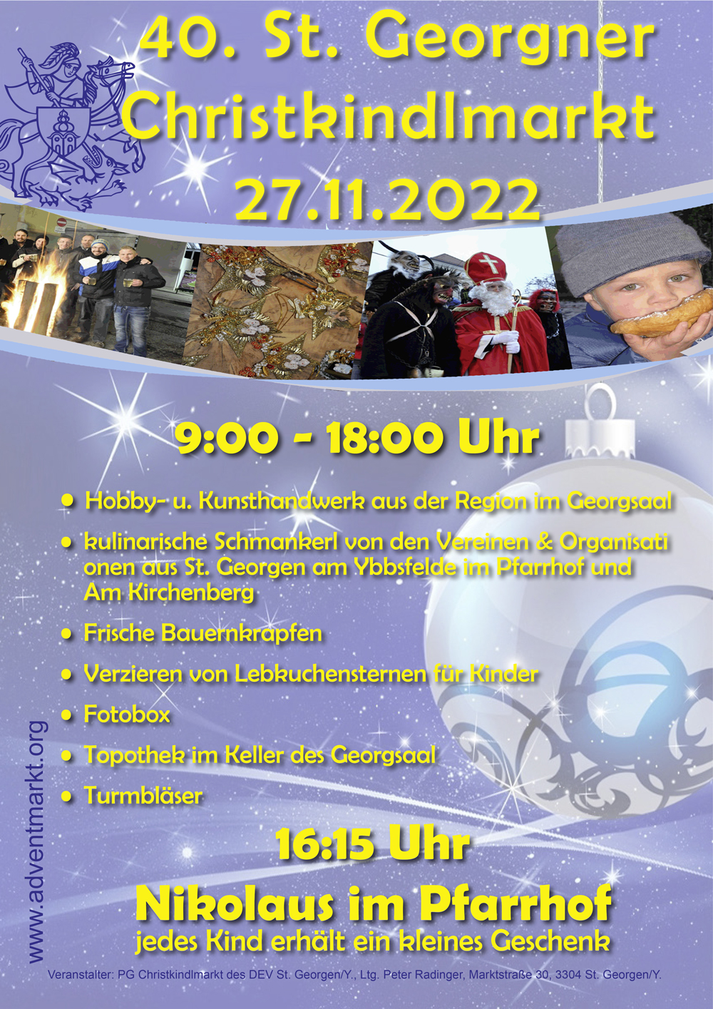 Bereits zum 40. Mal wird am 27. November der bekannte St. Georgner Christkindlmarkt abgehalten. Gönnen Sie sich einen vorweihnachtlichen Spaziergang durch den traditionellen Christkindlmarkt. Bei dieser Ausstellung präsentieren zahlreiche Hobbykünstler und Kunsthandwerker einen Querschnitt an volkstümlicher Kreativität im neu errichteten Georgssaal. Eine Vielzahl an Exponaten, hergestellt in handwerklicher Spitzenleistung und liebevoller Kleinarbeit aus verschiedenen Materialien, kann hier bewundert und käuflich erworben werden. Im Pfarrhof (Vorplatz des Georgssaales) sowie Am Kirchenberg verwöhnen Sie Vereine, Organisationen, Biobauern und Betriebe von St. Georgen mit bodenständigen Schmankerln. Am Stand der Projektgruppe Christkindlmarkt erwarten Sie frisch zubereitete Bauernkrapfen. Im Foyer des Georgsaales können die Besucher in gemütlicher Atmosphäre die beliebten Bauernkrapfen bei Tee oder Kaffee genießen. Um 16:15 Uhr kommt der Nikolaus zu den Kindern. Jedes Kind erhält eine Kleinigkeit vom Nikolaus!