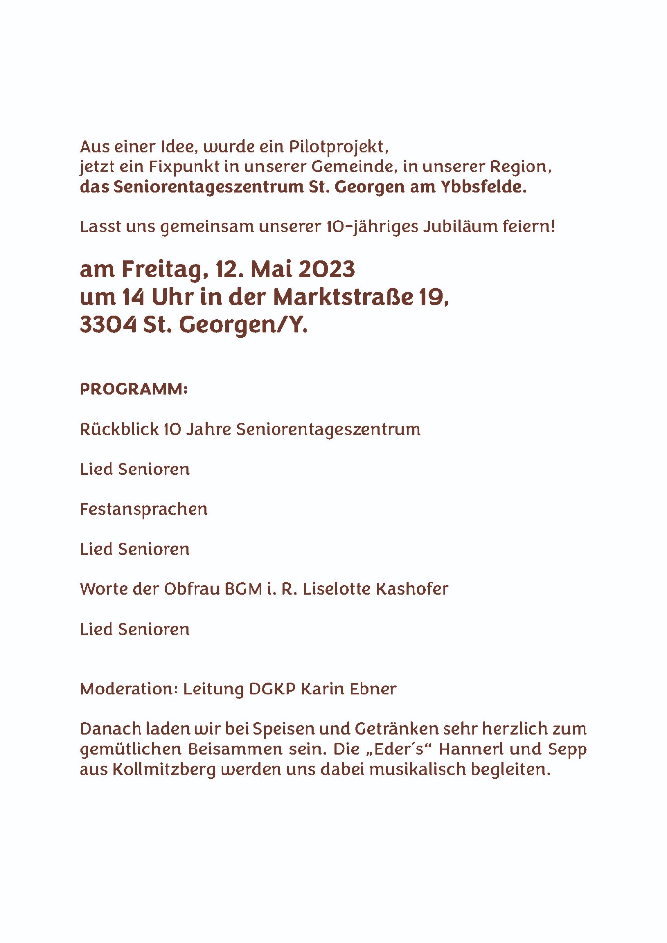 Danach laden wir bei Speisen und Getränken sehr herzlich zum gemütlichen Beisammen sein. Die „Eder´s“ Hannerl und Sepp aus Kollmitzberg werden uns dabei musikalisch begleiten.