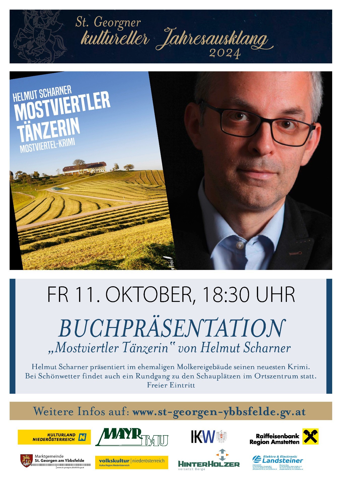 Der St. Georgner Autor Helmut Scharner hat wieder zugeschlagen. In seinem neusten Krimi „Mostviertler Tänzerin“ wählte er unsere Gemeinde als Schauplatz für das Verbrechen. Anlässlich der Bucherscheinung im Herbst präsentiert der Autor sein neuestes Werk direkt am Ort des Geschehens. Alle Interessierten Gemeindebürger und Fans sind daher am 11. Oktober, um 18:30 Uhr, am Molkereigelände, recht herzlich zur Buchvorstellung eingeladen. Im Anschluss an die Vorlesung können die Besucher einige der Schauplätze im Ort gemeinsam mit dem Autor besuchen und somit einen ersten Vorgeschmack auf den Krimi erhalten.