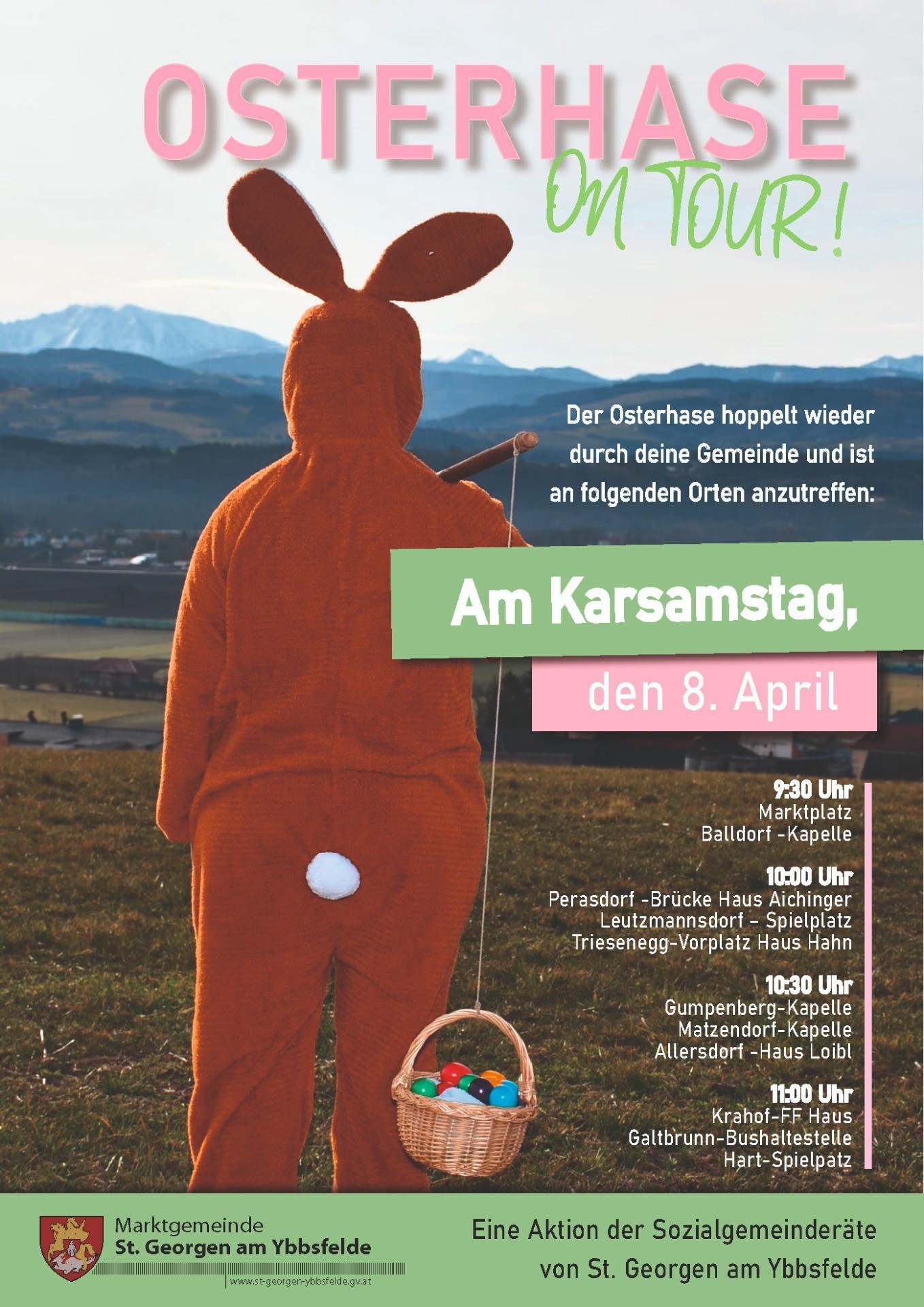 Auch in diesem Jahr hoppelt der Osterhase wieder durch das Gemeindegebiet von St. Georgen am Ybbsfelde und verteilt bunte Ostereier an Groß und Klein. Der Osterhase ist am Karsamstag, den 8. April vormittags an folgenden Orten anzutreffen: