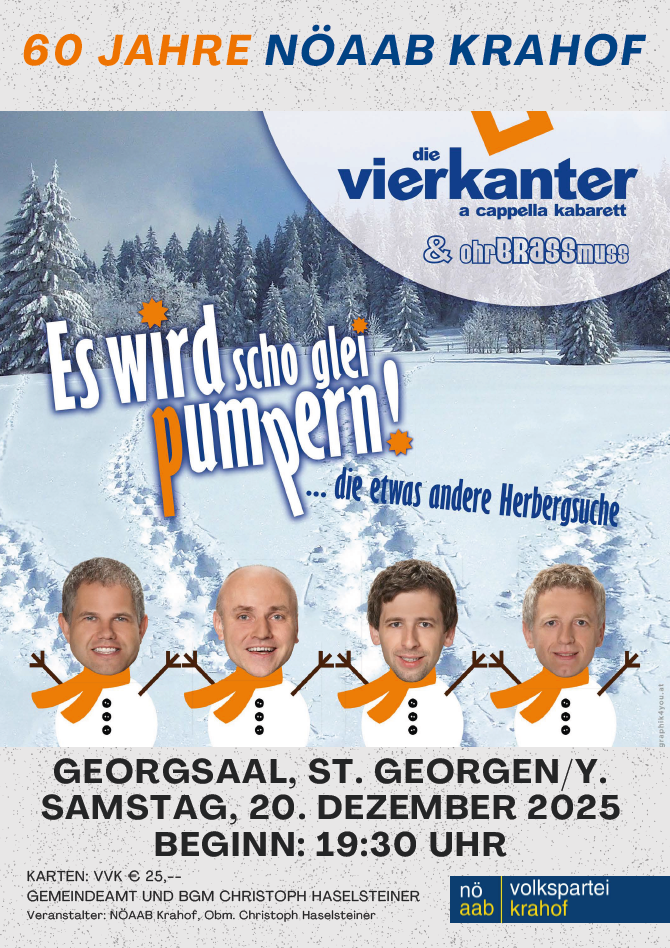 So ziehen die 4 Leisen (?) aus dem Kanterland los, um alle Fassetten dieser vorweihnachtlichen Zeit in gewohnt vierstimmiger Manier auf’s Horn zu nehmen. Gefolgt von einer treuen Schar Brass-Hirten, die ihre Weisen in den hell erleuchteten Nachthimmel und in Ihre Ohren blasen. Schaffen sie es gemeinsam auf ihrer etwas anderen Herbergsuche rechtzeitig einen passenden Christbaum zu finden und die Frauenquote zu erfüllen? Und schaffen SIE es, liebes Publikum, sich rechtzeitig dafür Karten zu sichern? Dann werden Sie lachend durch den Weihnachtstrubel kommen…